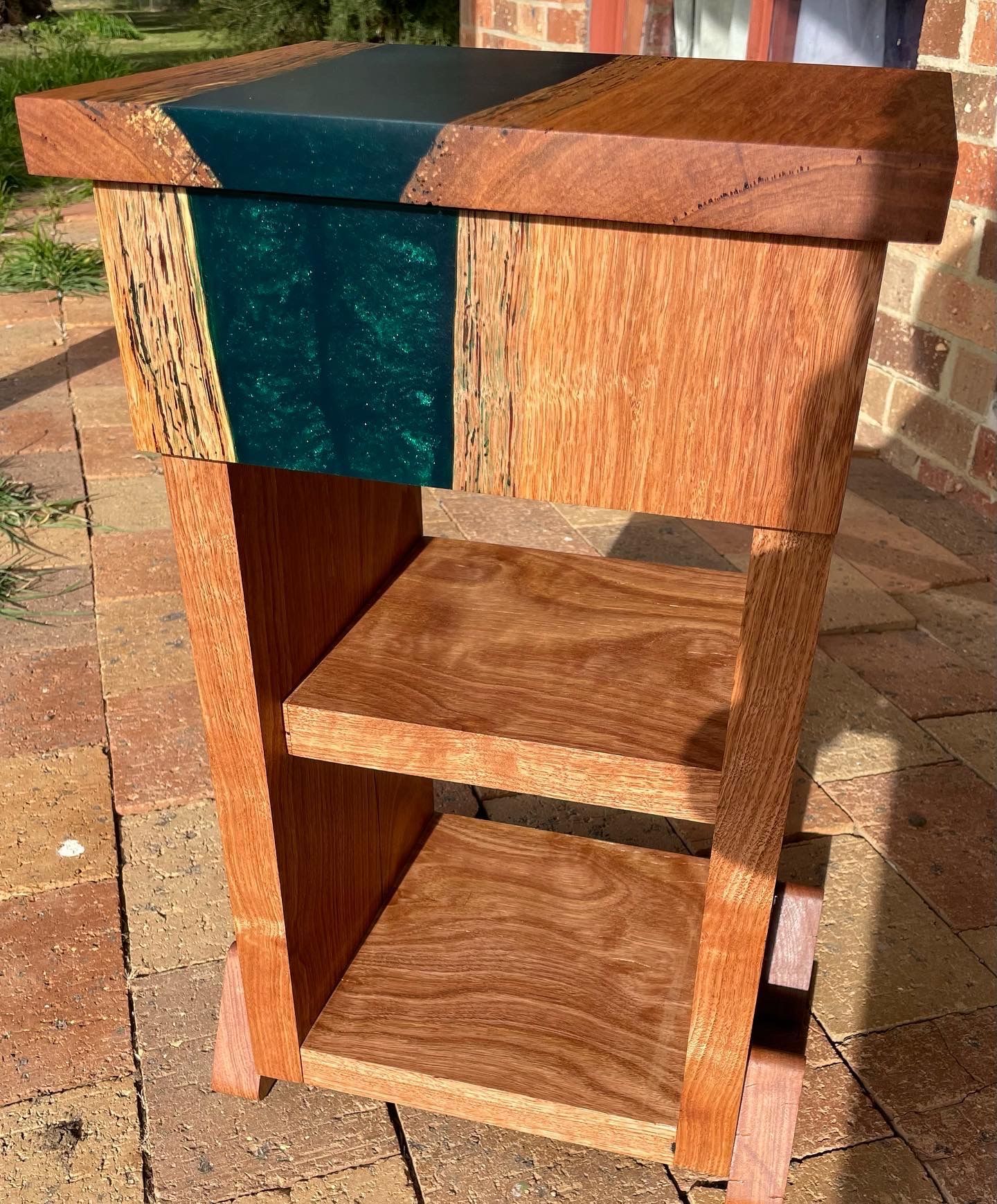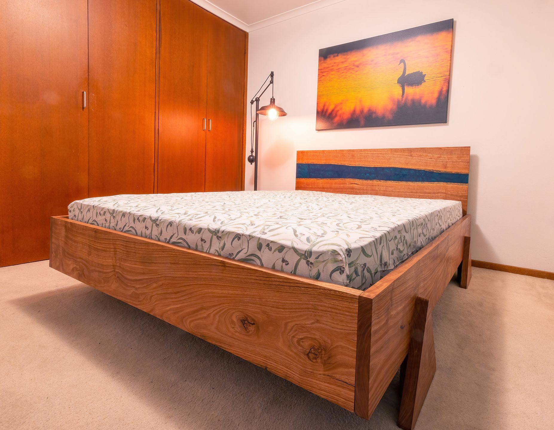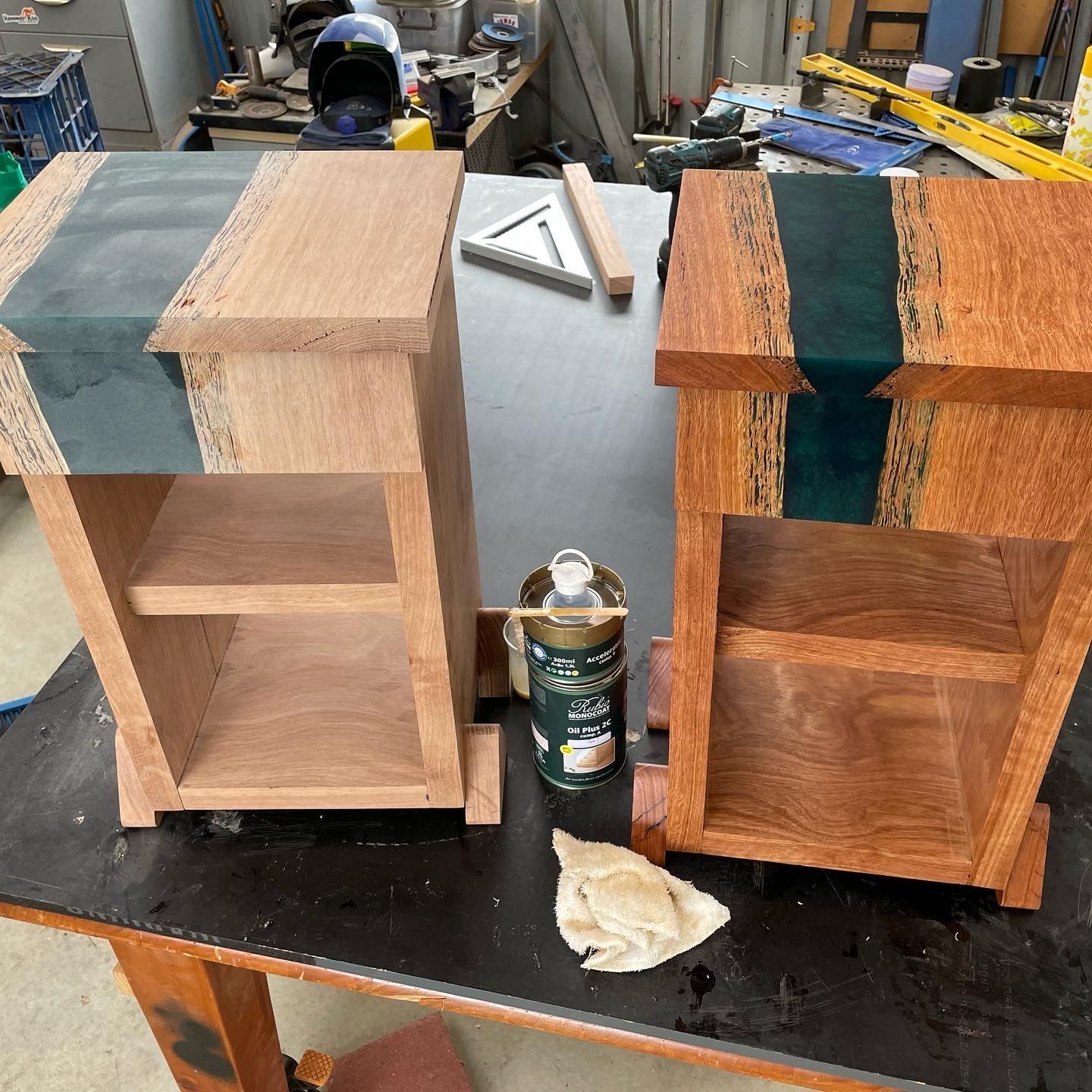 Matching bed and bedside tables, all Mountain Gum, Oakfield Clear for the Epoxy and finished in one of my favourites – Rubio Monocoat.