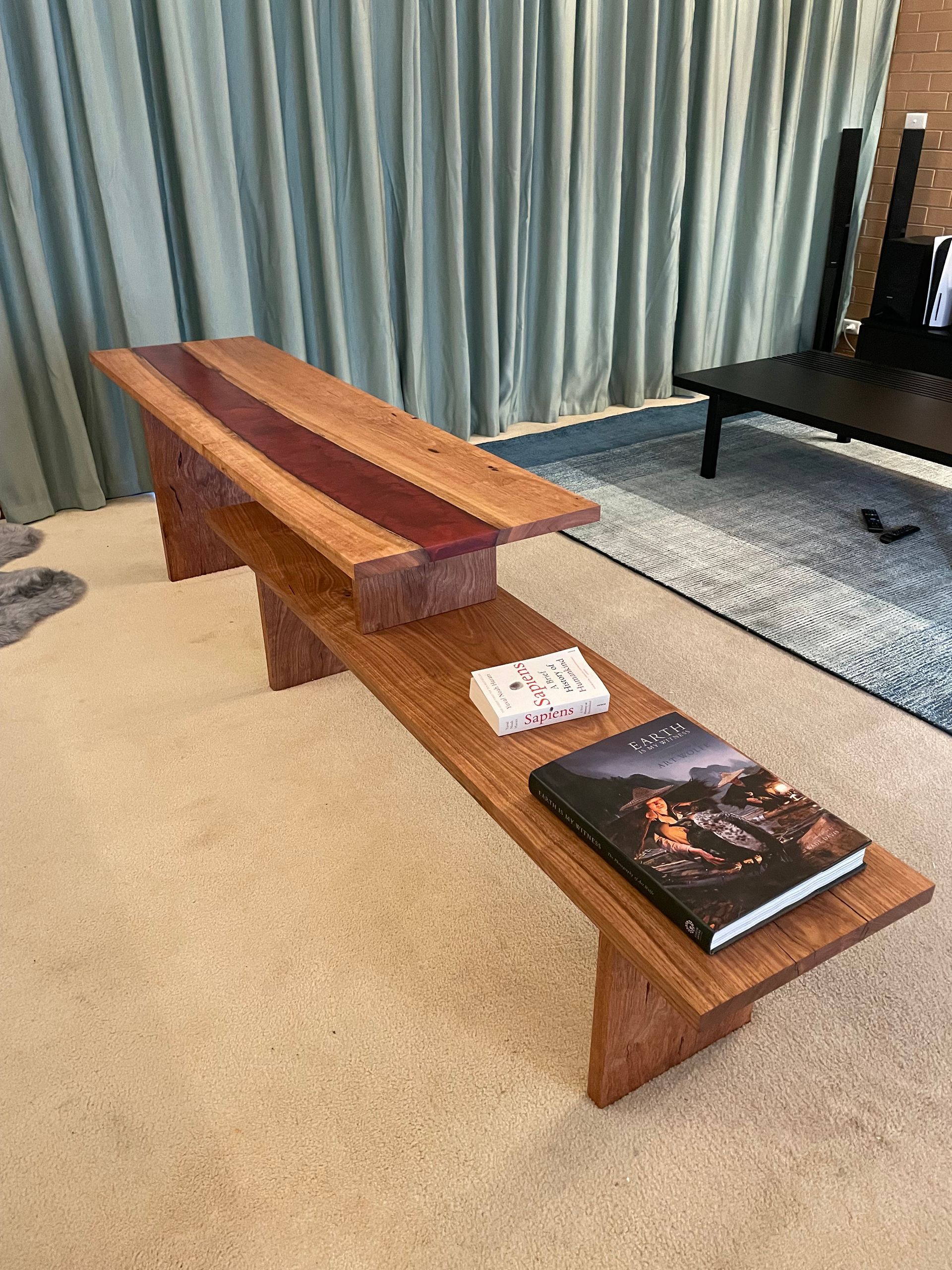 Also pictured is the previous adjustable TV Unit or shelf, with the fire red epoxy river.